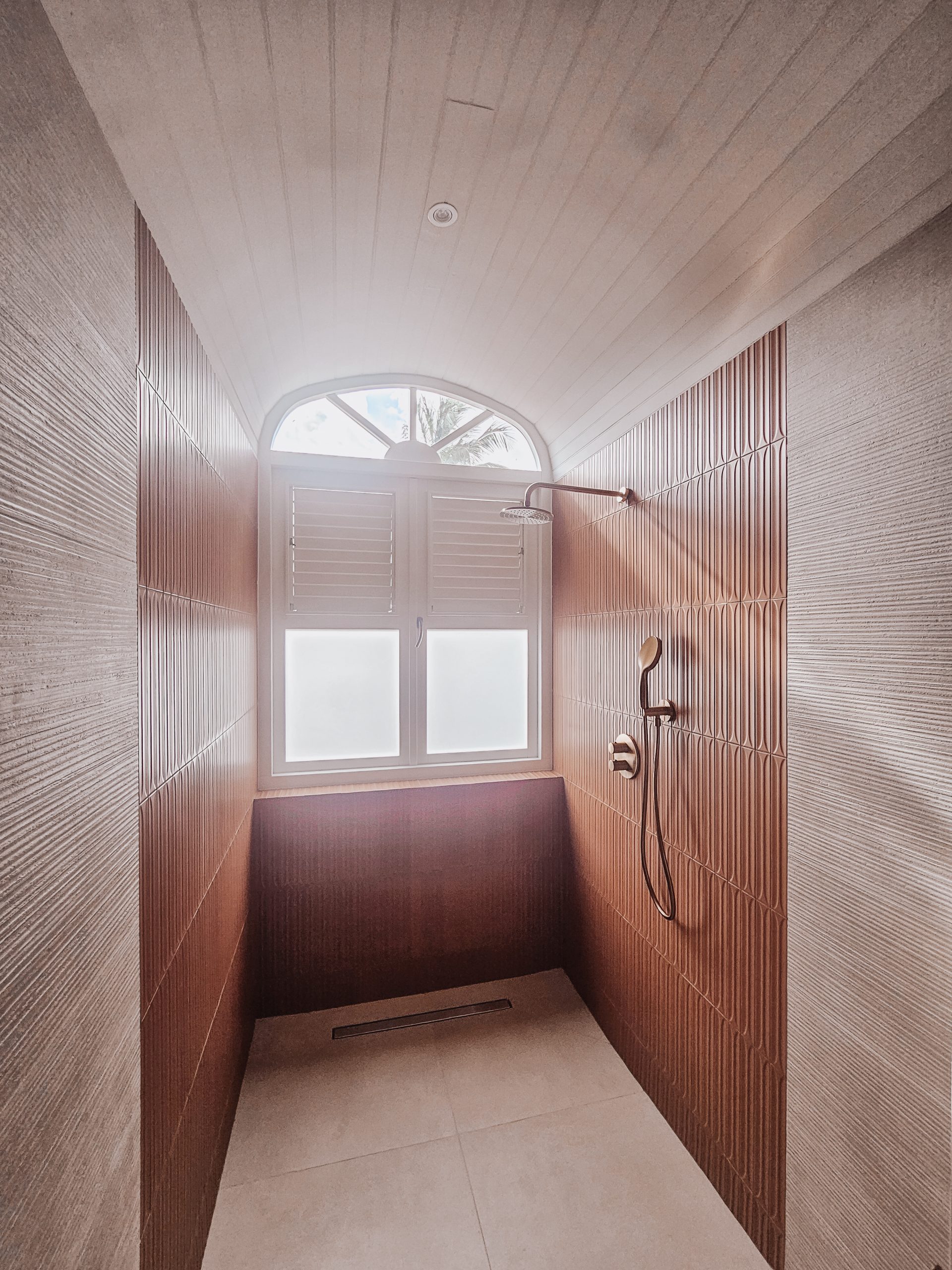 Elke badkamer heeft een eigen karakter en is ingericht in zachte tinten en natuurlijke materialen. De comfortabele inloopdouches met regendouche maken het een prettige plek om de dag rustig te beginnen of ontspannen af te sluiten.